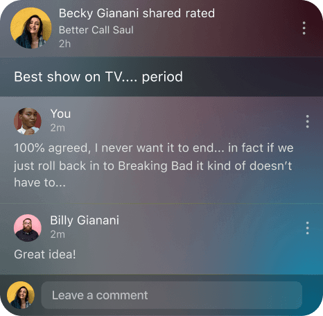 Turns out, finding what to watch next is better when you do it together, connecting with fellow friends and fans who love movies and shows just as much as you do.